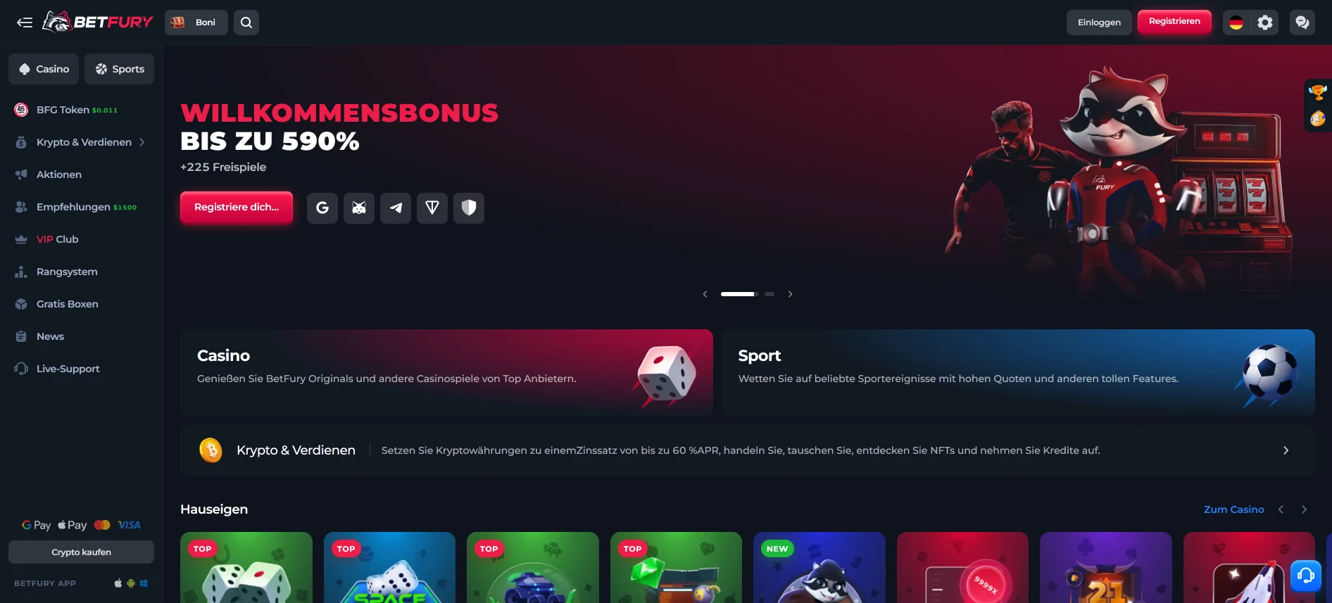 Im Bereich Aktionen wird zudem ein Boost für Kombiwetten angeboten, der für Neu- und Bestandskunden gleichermassen interessant sein kann. Wechselnde BetFury Promo Codes sind ebenfalls verfügbar.